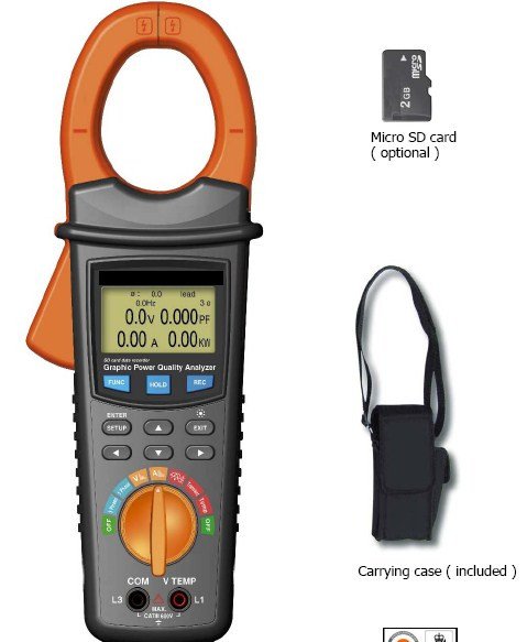 The clamp power analyser is a very economical solution for the analysis of single phase or balanced 3 phase systems with voltages to 600VAC and current to 2000 amps. The product is related to the Lutron DW 6095 series 3 phase power analysers and uses the same SD card logging. Readings are logged from every 2 second to 7200 seconds as instantaneous values. It also captures 3 types of transient events with programmable threshold. The display is graphical dot matrix and has many graphic formats including waveform on voltage and current - phasor diagram and others.
